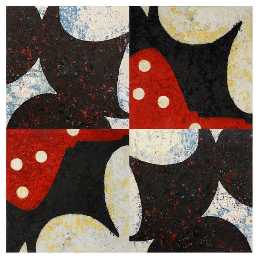 The fact that Rainer Gross incorporates company logos or signets of pop culture like the Batman symbol or Mickey Mouse in his “Contact Paintings” shows that he wants to integrate an external relation, a subject matter in his painting again. But it would be premature to say that by doing so he had left abstract painting. One could even say that the “Logo Paintings” are abstractions of abstractions. This is because logos are in themselves abstract, sign-like compactions not only as indicators of certain products, but also of fundamental principles of global capitalism (the role of advertising, the big companies as global players a.s.o.); in many cases logos very decisively stand for a sense of life. The white curved lettering on red background of Coca Cola, for instance, stands like no other symbol for the American Way of Life and is understood this way all over the world and quoted in many contexts. Newer logos like those of Apple, Facebook or Twitter stand for the lifestyle of the younger generation, integrating as a matter of course being online and communication in social networks.