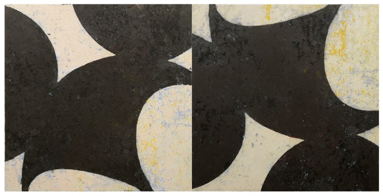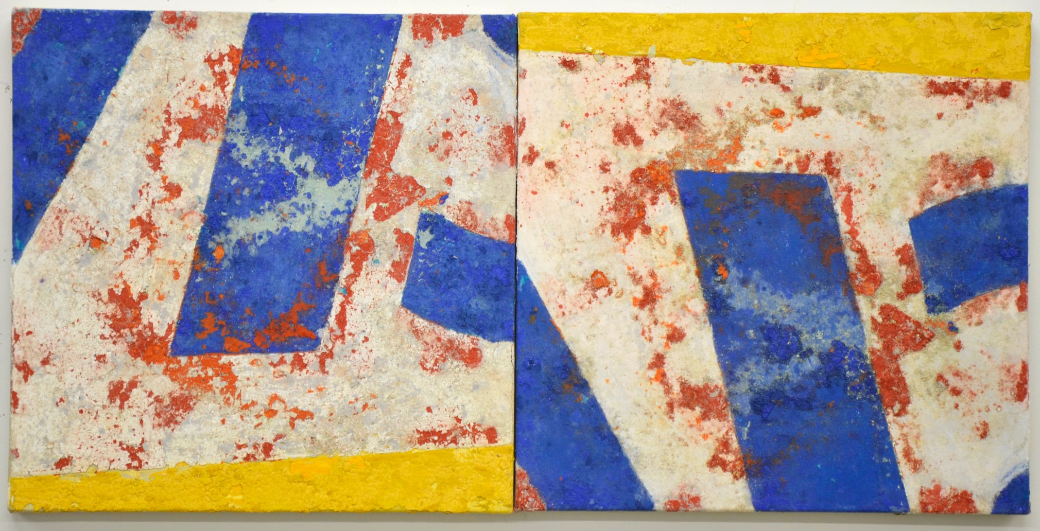 It was somewhat by chance – provided there can be anything like chance on this artistic level – that Rainer Gross discovered, when he produced monotypes on paper, how fascinating the amorphous remnants of colour were which stuck to the roughened surface of the acrylic plate after printing. Gross began to look for a method to create this kind of colour phenomena in large-scale paintings, too. He discovered the technique of pressing canvases coloured by different colour-materials on each other. One of the two was covered with dry pigments, the other one with still wet oil colours. Carefully separating the two canvases made many or few layers of pigment stick to the wet oil colours, correlating with the pressure exerted. So each time a pair of identical twins were generated, albeit with “genetic defects”, as both twins weren’t only reversed in orientation, but also because the deeper layers of pigment came out on top of the other canvas and the pigments reacted with each other differently in each case. Using this technique, Gross was able to accentuate a multitude of different subjects: structure, colour, chance, process, but also conceptual questions concerning the states of original and duplicate, respectively copy.