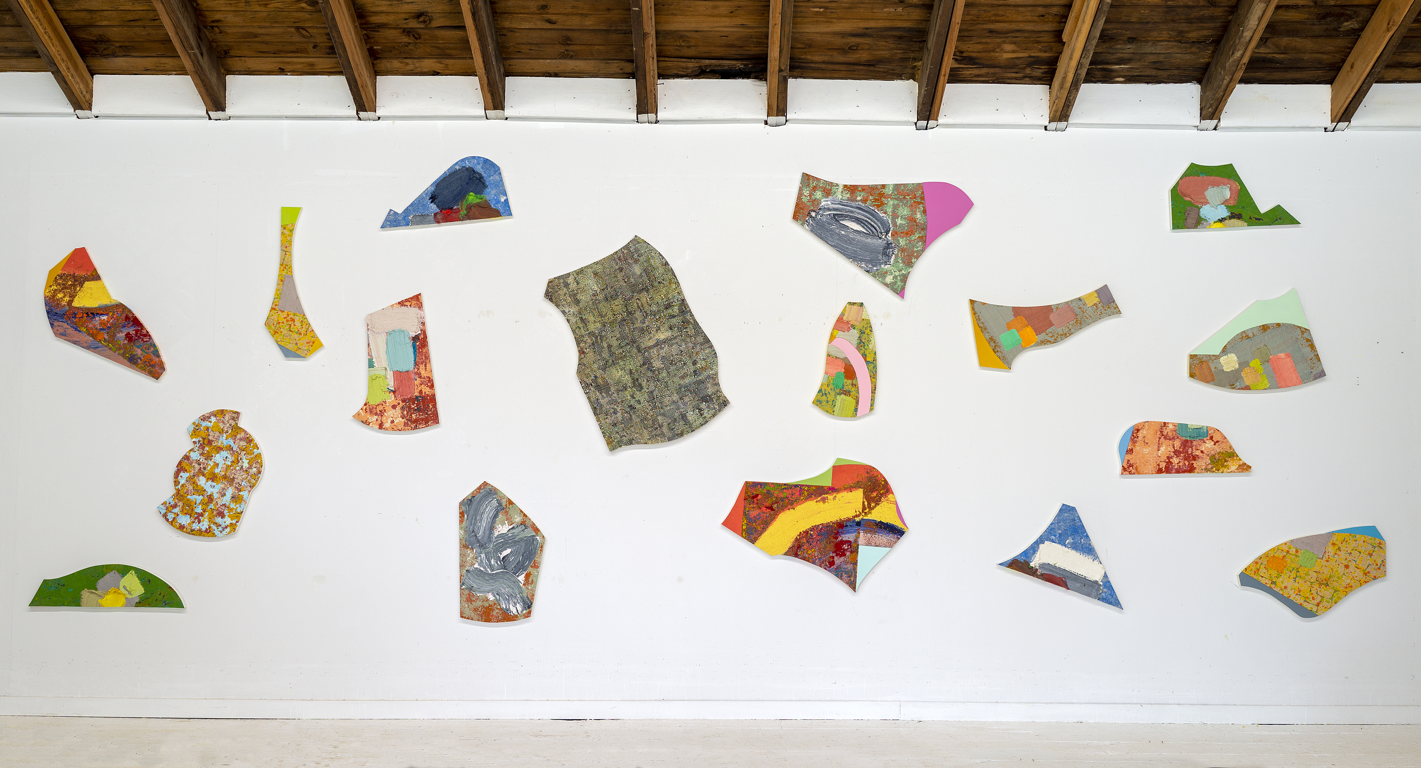 All pieces are made of oil paint, pigments, spray paint and canvas on verestex board.