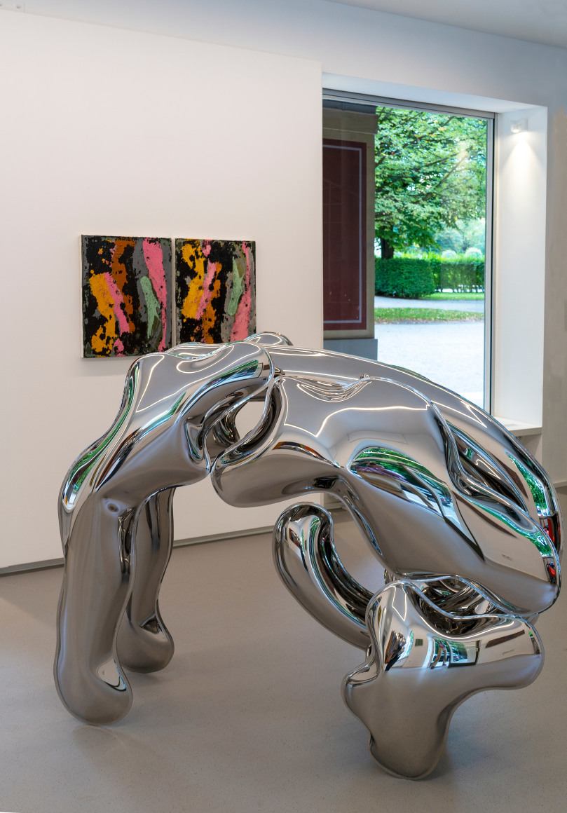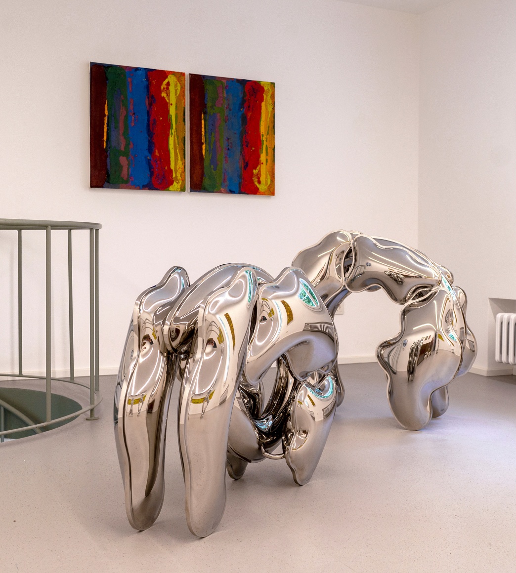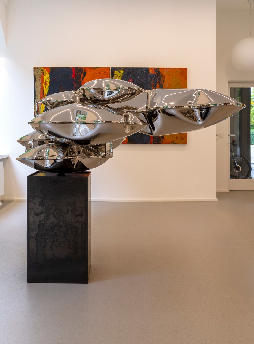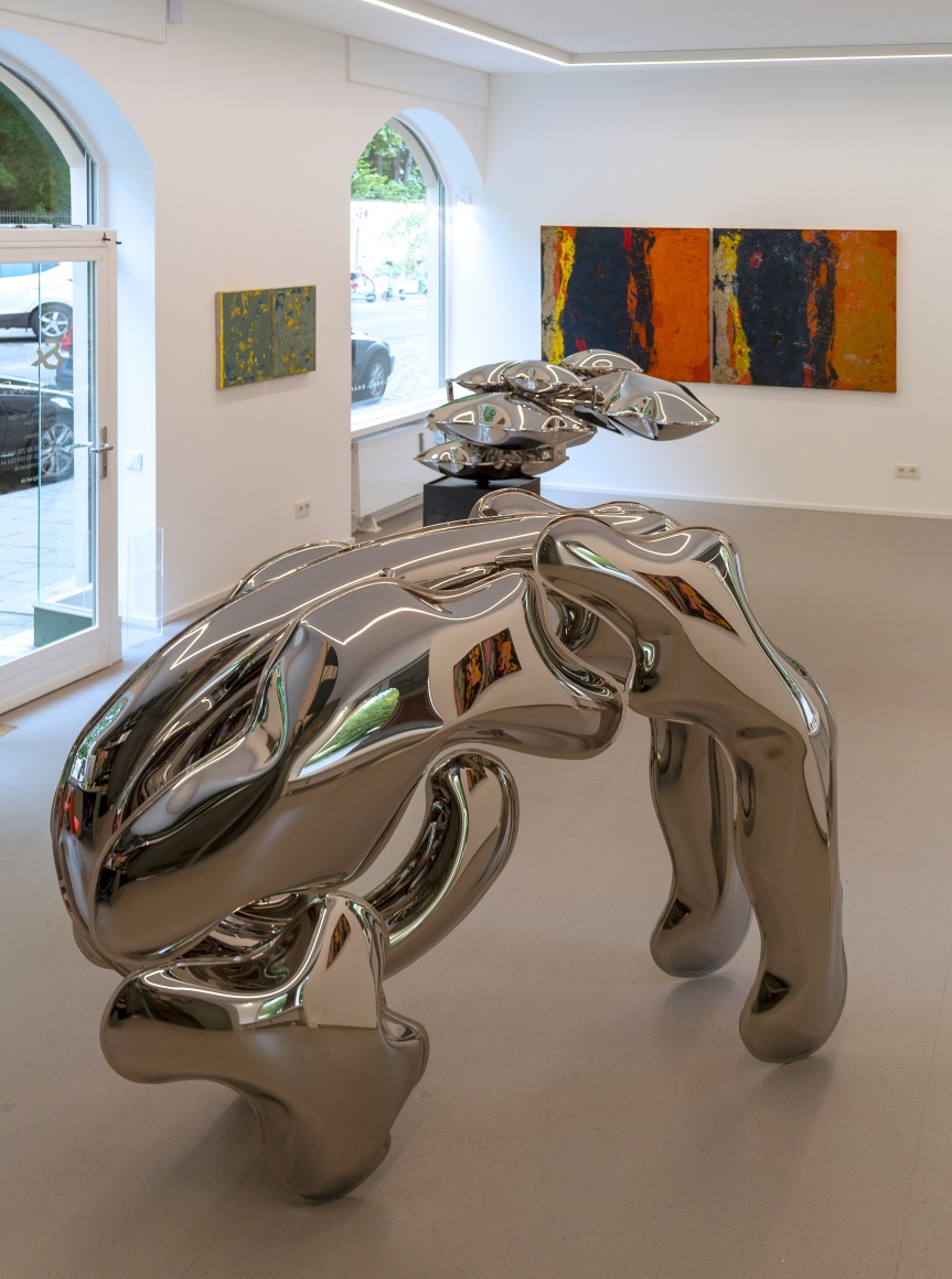 Dem gegenüberstellt werden die Edelstahlskulpturen von Thomas Kühnapfel, die eine Leichtigkeit und organisch fließende Anmutung ausstrahlen. Eine Besonderheit manifestiert sich im Entstehungsprozess, bei dem der Künstler den Edelstahl mit Hilfe von kalkulierten hydraulischen und physikalischen Kräften durch Luft- und Wasserdruck mit Volumen ausformt und so einen begrenzten Raum von innen heraus erzeugt. Dabei folgt die Form der Kraft.
