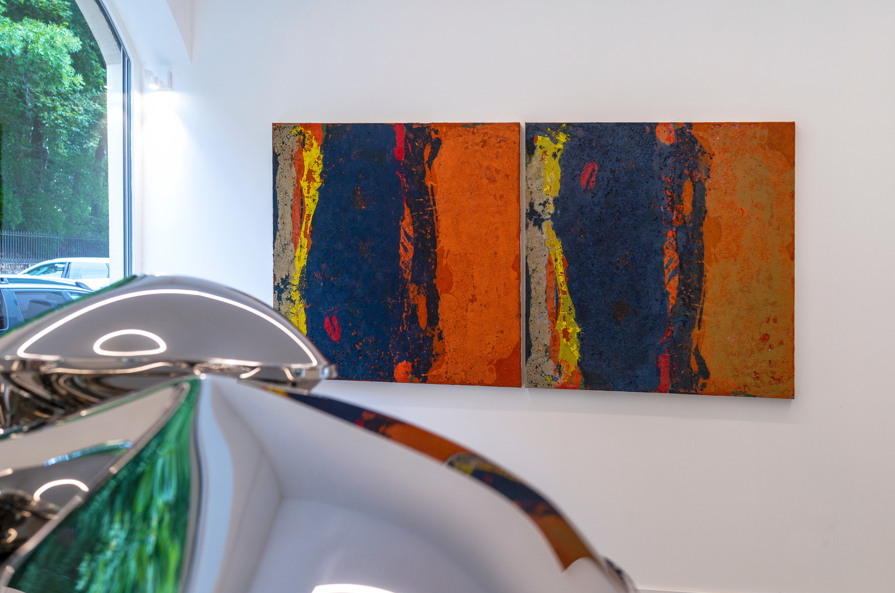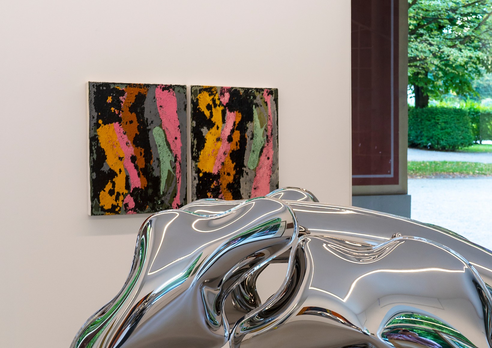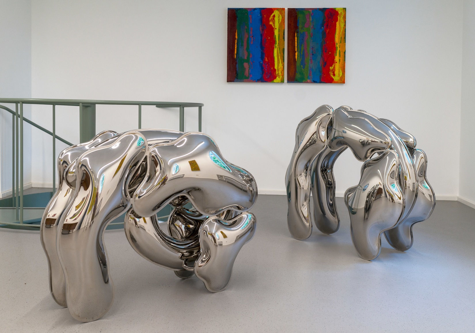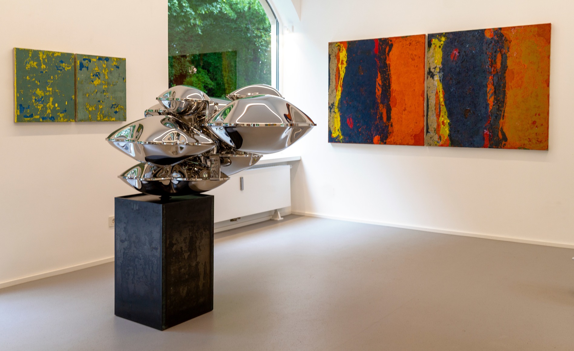 Dem gegenüberstellt werden die Edelstahlskulpturen von Thomas Kühnapfel, die eine Leichtigkeit und organisch fließende Anmutung ausstrahlen. Eine Besonderheit manifestiert sich im Entstehungsprozess, bei dem der Künstler den Edelstahl mit Hilfe von kalkulierten hydraulischen und physikalischen Kräften durch Luft- und Wasserdruck mit Volumen ausformt und so einen begrenzten Raum von innen heraus erzeugt. Dabei folgt die Form der Kraft.