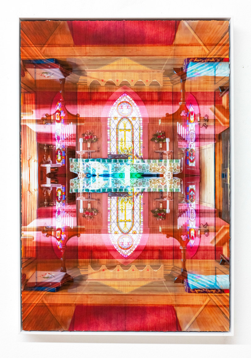 Certain particulars in each church come vividly into focus: details from stained glass windows, the range of surfaces, like spectacular gilding (Polish church on Depot Rd. in Cutchogue); maple hued wood carving with medieval detailing; pigmented trefoil motifs (Redeemer, Mattituck); the boat-like ark lectern at nautically themed St. Peters in Greenport, or the refined carpenter Gothic interior at Holy Trinity Greenport. Particularly dazzling is the work inspired by the Greek Orthodox church of Greenport with its multiple saint iconostasis. Gross has honed in on such elements, and by the kaleidoscopic effects produced by his handling of the imagery, elicits the potential of experiencing these structures, and their underlying use and symbolism, in a fresh light.