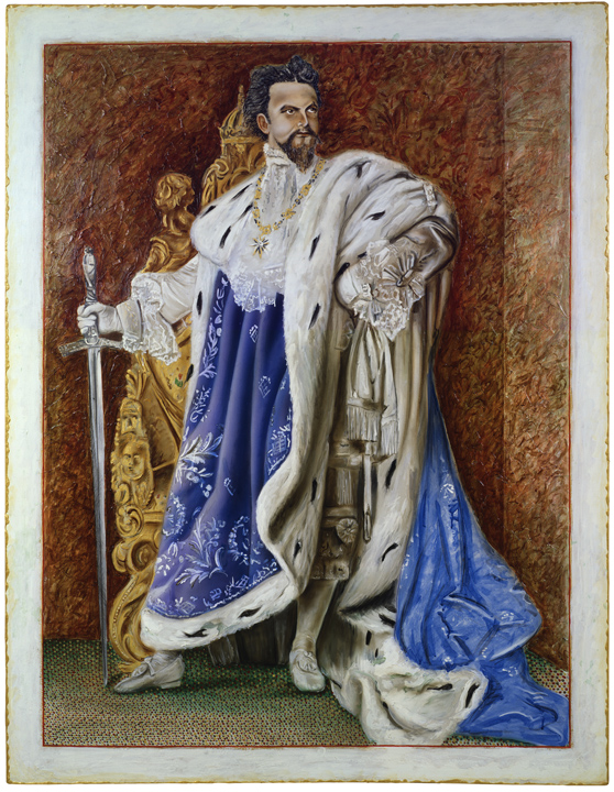 Arriving in the East Village in New York in 1972, I noticed the Bauhaus estetic had not made any inroads into Latin furniture design. Most funiture places in the area were full of elaborate baroque style headboards and "king style" chairs. So I decided to combine the new found late Latin Baroque with the offical portrait of Ludwig II, who was also late to this style. The result blended both experiences.